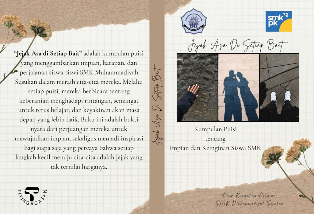 Sinopsis“Jejak Asa di Setiap Bait” adalah kumpulan puisi yang menggambarkan impian, harapan, dan perjalanan siswa-siswi SMK Muhammadiyah Susukan dalam meraih cita-cita mereka. Melalui setiap puisi, mereka berbicara tentang keberanian menghadapi rintangan, semangat untuk terus belajar, dan keyakinan akan masa depan yang lebih baik. Buku ini adalah bukti nyata dari perjuangan mereka untuk mewujudkan impian, sekaligus menjadi inspirasi bagi siapa saja yang percaya bahwa setiap langkah kecil menuju cita-cita adalah jejak yang tak ternilai harganya.